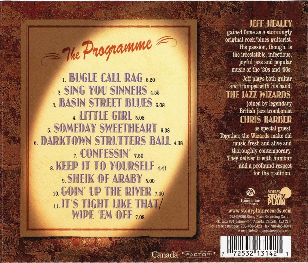 According to Healey, their first contact was over the phone, when Barber invited him to join his band as a special guest for European concerts. Healey, reluctant to spend long periods away from home, instead invited Barber to come to Canada and perform with The Jazz Wizards. Barber accepted and wrote about this in his autobiography Jazz Me Blues [Equinox Publishing Ltd., Sheffield, GB (2014)]: „The group I was to play with was run by a fellow called Jeff Healey. … But Jeff also ran a band called the Jazz Wizards, because his other undying love was 1920s jazz by Louis Armstrong, and the vocals of Bing Crosby. So in that group he mainly played trumpet and sang. … He was a lovely man, and while I was in Canada playing with his band we made a record. During the recording I pushed myself forward slightly to have my own blues „Going Up The River“ included, but I’m glad we did it because whenever I hear it, I have a way of remembering Jeff Healey“.